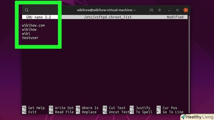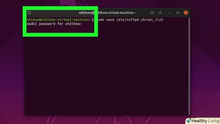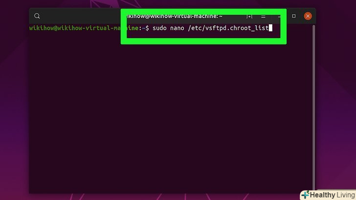 - Відкрийте текстовий файл "chroot". Введітьsudo nano /etc/vsftpd.chroot_list і натисніть ↵ Enter.