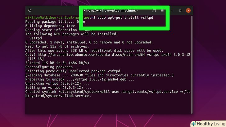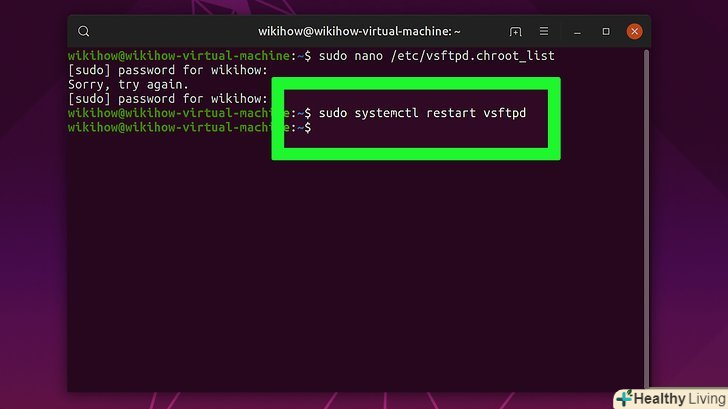 - Перезапустіть VSFTPD. Введітьsudo systemctl restart vsftpd натисніть ↵ Enter. VSFTPD буде перезапущено, а внесені зміни збережені. Тепер ви отримаєте доступ до свого FTP-сервера.[3]