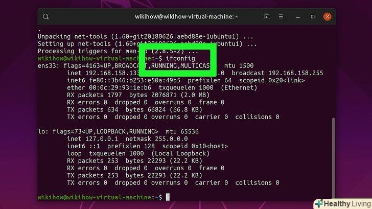 - Якщо утиліта "ifconfig"не встановлена, встановіть її; для цього в терміналі введітьsudo apt-get install net-tools.