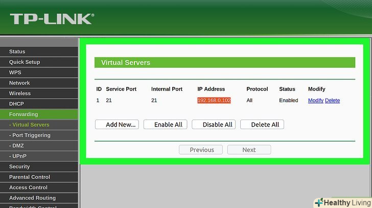 - Налаштуйте переадресацію порту на маршрутизаторі. Дізнавшись IP-адресу свого сервера, налаштуйте переадресацію порту 21 маршрутизатора на цю адресу; переконайтеся, що порт використовує протокол TCP (а не UDP або UDP/TCP).