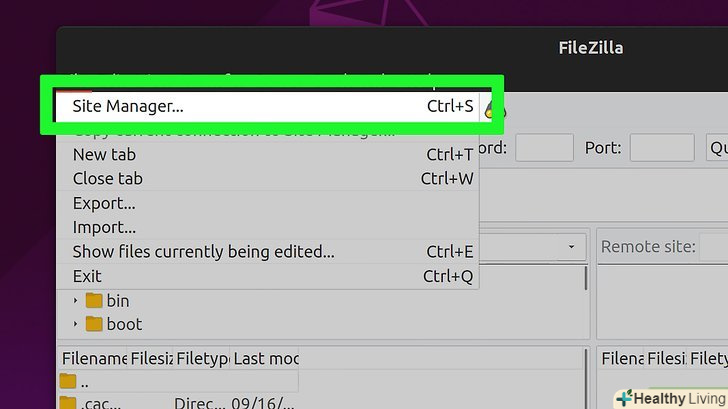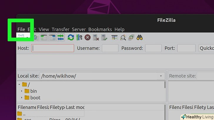 - Клацніть поФайл. Це меню знаходиться у верхньому лівому куті вікна FileZilla. Розкриється меню.