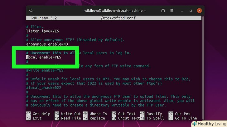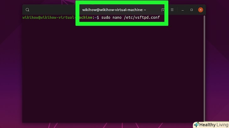 Відкрийте файл конфігурації VSFTPD. введіть sudo nano /etc/vsftpd.conf і натисніть ↵ Enter. Потрібно відредагувати цей файл, щоб включити (або відключити) деякі функції VSFTPD.