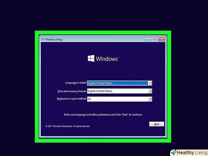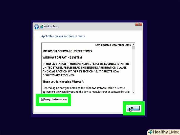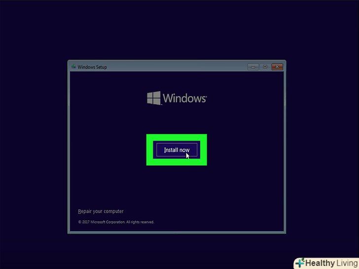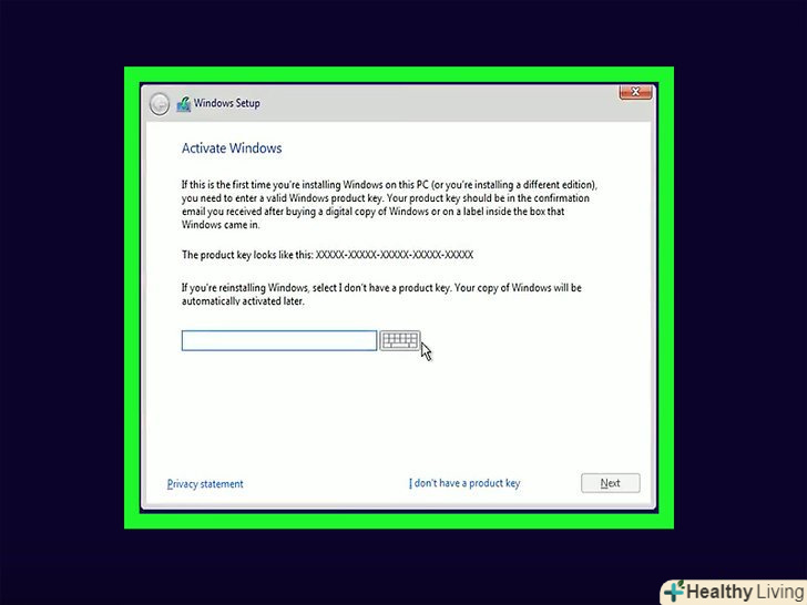 Введіть ключ продукту Windows 10, а потім натиснітьДалі. Ключ продукту введіть в текстовому полі в нижній частині вікна.- Також можна натиснути на посилання "у мене немає ключа продукту", щоб ввести ключ пізніше. В цьому випадку потрібно вказати версію Windows.