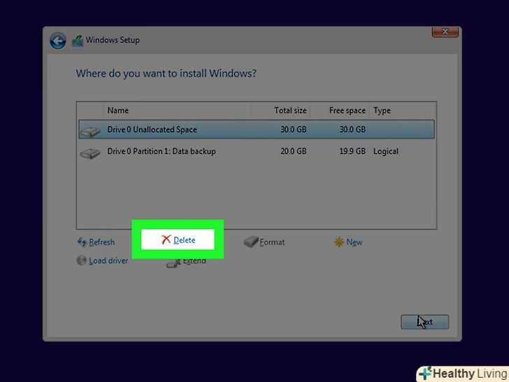 Видаліть розділ з Ubuntu.натисніть «Видалити", а потім натисніть "ОК", коли з'явиться запит. Система Ubuntu буде видалена, а локальний диск буде відформатований у файловій системі NTFS, яка використовується системою Windows.- Можливо, спочатку потрібно натиснути "Параметри диска" під вікном.