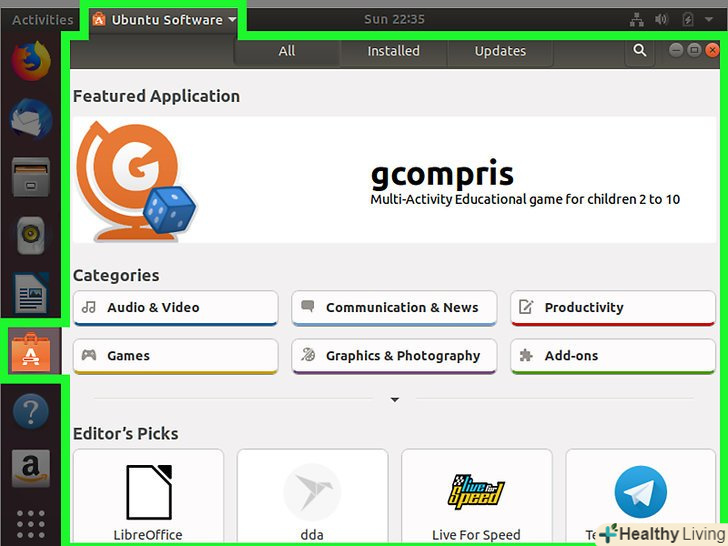 Відкрийте Центр додатків Ubuntu.його значок виглядає як помаранчевий чемодан з білою літерою "а". Цей менеджер програмного забезпечення попередньо інсталюється в Ubuntu Linux і дозволяє з легкістю видаляти програми.- Якщо ви не можете знайти значок центру додатків Ubuntu, клацніть по логотипу Ubuntu у верхньому лівому куті екрану, в рядку пошуку введітьцентр додатків, а потім клацніть по значку центру додатків Ubuntu.