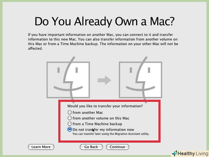 Вирішіть, чи хочете ви передати будь-які дані.оскільки ви виконуєте установку "з нуля", у вас немає даних, які можна було б імпортувати. Пізніше ви зможете скопіювати збережені раніше резервні копії файлів. Виберіть "не передавати зараз ніякої інформації" і натисніть Continue.