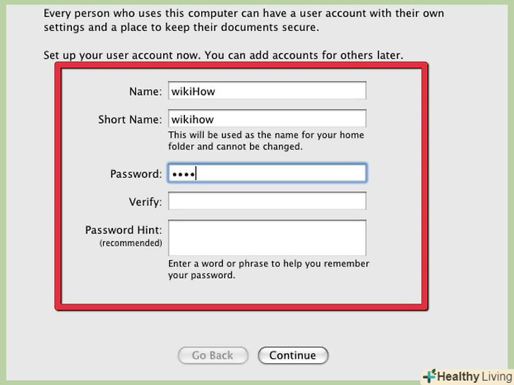 Створіть обліковий запис адміністратора. обліковий запис адміністратора-це обліковий запис, що володіє правами на зміну системних налаштувань і установку ПЗ. Якщо це ваш комп'ютер, введіть своє ім'я в поле " Ім'я "і псевдонім в поле"коротке ім'я". Найчастіше користувачі в поле" коротке ім'я " вводять своє ім'я з маленької літери.- Коротке ім'я використовується для створення мітки домашньої директорії.