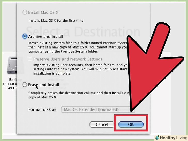 Виберіть тип установки. натисніть на кнопку Options... у вікні "вибрати шлях установки". При установці OS X вам доступні дві опції:" Архівація і установка "і"видалення і установка". Виберіть відповідний тип процесу і натисніть на кнопку OK.- "Архівація та установка" створює копію системних файлів, а потім виконує установку. Якщо ви обираєте цей тип, ви також можете зберегти дані користувача та налаштування мережі. Цей варіант не рекомендується вибирати, якщо ви відчуваєте проблеми з поточною встановленою версією OS X. при такому способі установки вам доведеться вручну перевстановити всі наявні програми, інакше вони можуть неправильно працювати.
