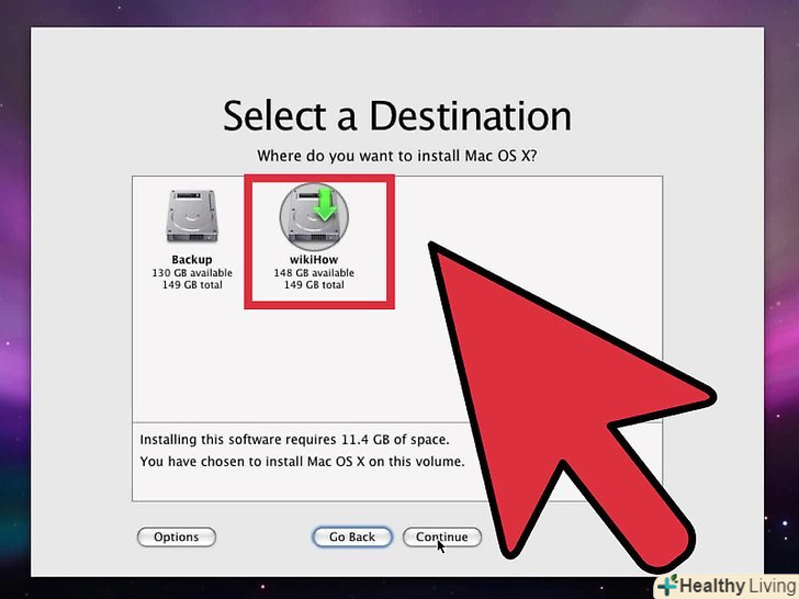 Виберіть шлях установки. якщо на вашому комп'ютері кілька жорстких дисків або розділів дисків, ви можете вибрати, куди встановити OS X. буде показано кількість вільного місця на диску і кількість місця, необхідного для установки OS X. виберіть жорсткий диск, на який хочете встановити OS X і натисніть на Continue.[3]- Використовуйте випадаюче меню "форматувати диск як", щоб вибрати варіант форматування " Mac OS X Extended (журнальний)".