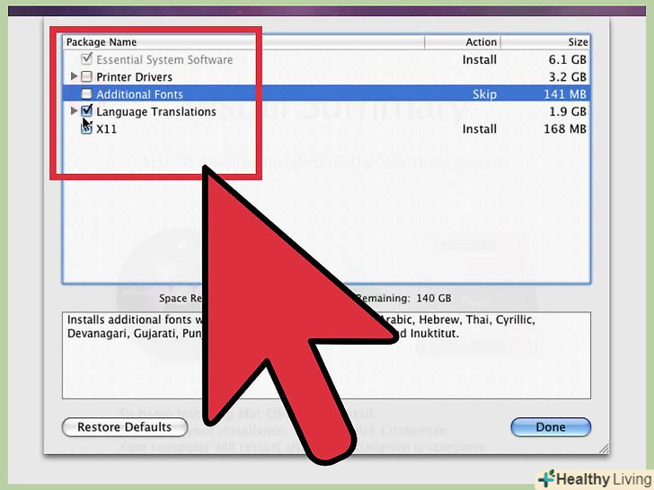 Виберіть ПЗ, яке хочете встановити. установник покаже список всіх додаткових пакетів програм, які будуть встановлені разом з OS X. Якщо у вас не так багато місця на жорсткому диску, ви можете відмовитися від найменш важливих файлів, натиснувши на кнопку Customize....- Розгорніть секцію "драйвери принтерів" і приберіть галочку з драйверів, які вам не знадобляться.