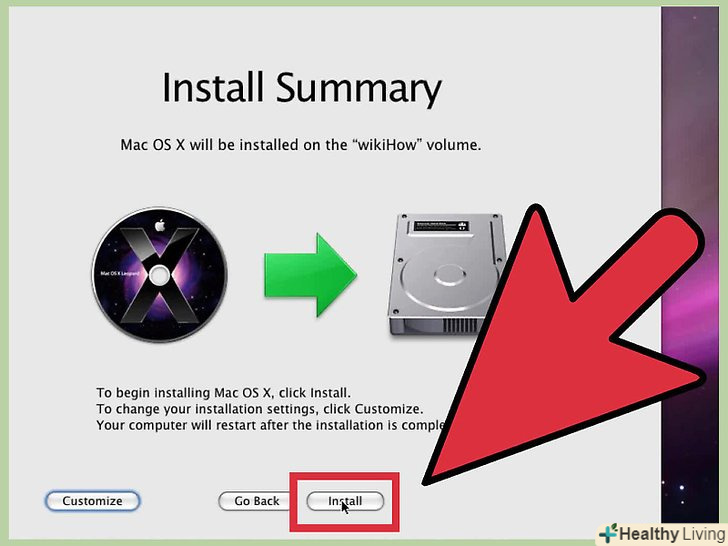 Запустіть процес установки з робочого комп'ютера.якщо на вашому комп'ютері можна завантажити OS X, ви можете запустити процес установки з самої операційної системи. Вставте інсталяційний диск DVD в комп'ютер і дочекайтеся, поки на робочому столі з'явиться іконка. Двічі клацніть на іконку "Install Mac OS X" і потім натисніть Restart.