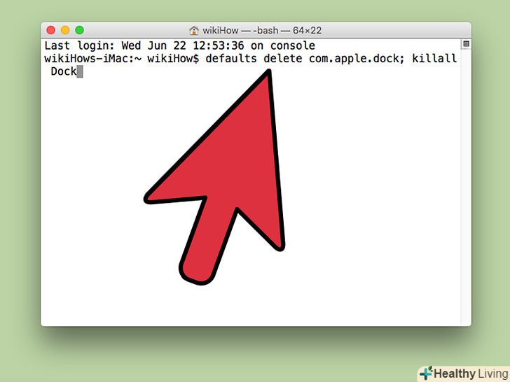 Скиньте Налаштування Дока. якщо описані вище методи не спрацювали, скиньте Налаштування Дока до налаштувань за замовчуванням. Це призведе до видалення всіх значків, які були додані в Док користувачами.[2]- Відкрийте "Додатки» – «утиліти» - "Термінал".