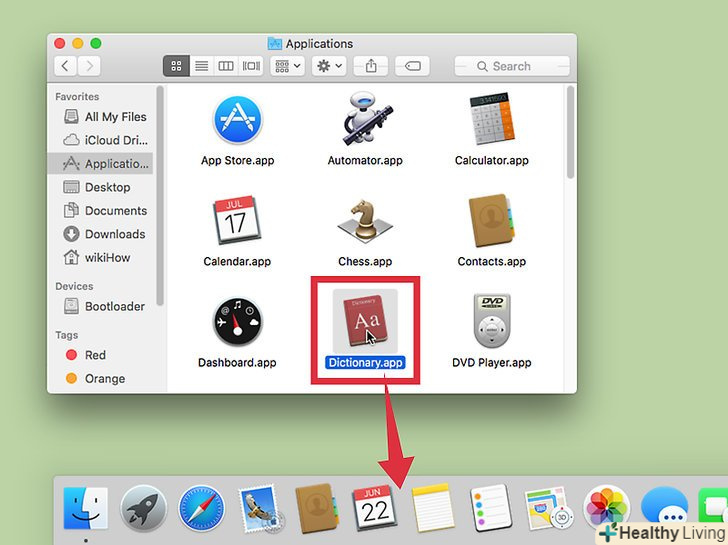 Помістіть значок в Док.наведіть значок програми на Док і дочекайтеся моменту, коли два сусідніх значка розсунуться і звільнять місце для нового значка. Відпустіть кнопку миші, щоб помістити значок в Док.