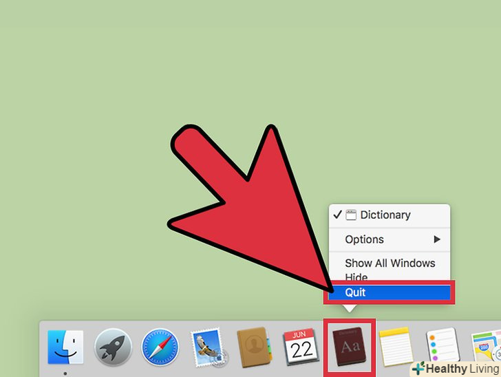 Закрийте програму. у доці відображаються значки всіх запущених програм. Для початку закрийте програму, щоб переконатися, що значок був видалений з Дока.- Програма запущена, якщо біля її значка в доці відображається маленька точка (навіть якщо вікно програми закрито). Клацніть правою кнопкою миші по значку (або затиснітьControl) і в меню виберіть «Вихід» або «Примусовий вихід», щоб закрити програму.