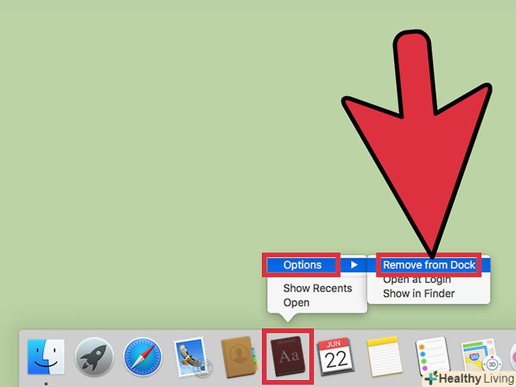 Використовуйте контекстне меню (відкривається натисканням правою кнопкою миші).за допомогою цього меню значок можна видалити з Дока.- Клацніть правою кнопкою миші по значку (або затиснітьControl ) і клацніть).