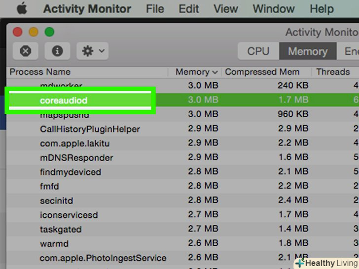 - У списку знайдіть процес "coreaudiod". Клацніть по заголовку "Ім'я", щоб відсортувати список за алфавітом.