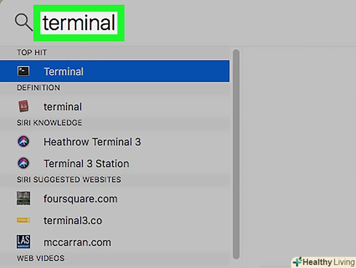 Знайдіть термінал. введіть термінал у рядку пошуку Spotlight посередині екрана.