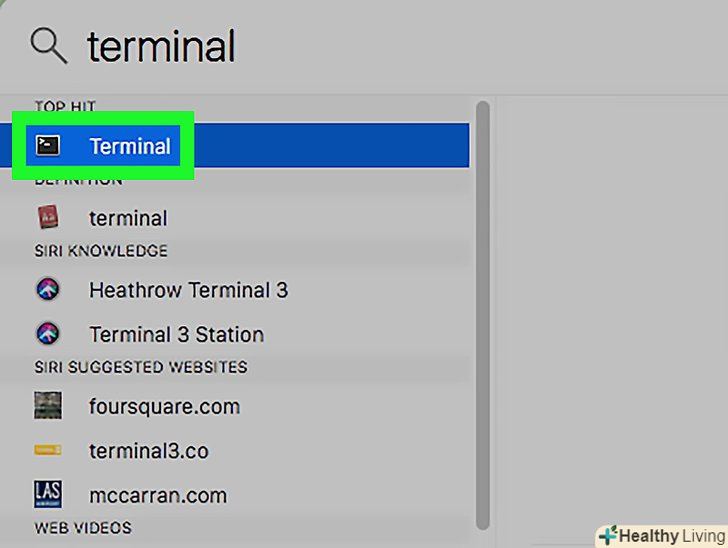 Двічі клацніть по «Термінал». цей значок знаходиться під рядком пошуку Spotlight. Відкриється термінал.