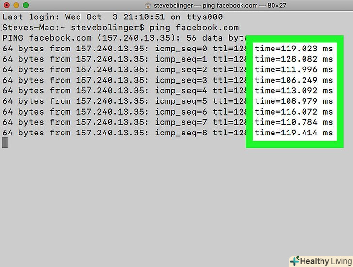 Перегляньте результати. вони відобразяться під командою «ping». За результатами можна судити про якість з'єднання між вашим комп'ютером і адресою, який ви пінгували:- "час= # мс" — де " # " є числом) - це кількість мілісекунд, необхідне на те, щоб адреса відповів на ваш запит.
