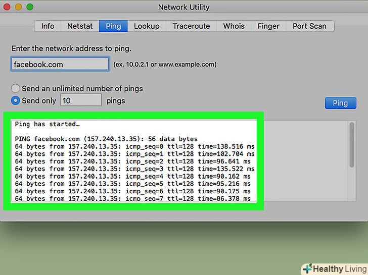 Перегляньте результати. вони відобразяться на білій панелі внизу вікна мережевої утиліти. За результатами можна судити про якість з'єднання між вашим комп'ютером і адресою, який ви пінгували:- "час= # мс" – де " # " є числом) - це кількість мілісекунд, необхідне на те, щоб адреса відповів на ваш запит.