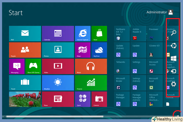 Панель Експрес-кнопок. щоб викликати меню Експрес-кнопок, перемістіть покажчик у верхній правий кут і виконайте перетягування вниз. Так ви зможете викликати системний час і меню управління деякими функціями комп'ютера. Обов'язково ознайомтеся з широкими можливостями даного меню.[3]- Пошук дуже схожий на кнопку "всі програми" в оригінальному меню " Пуск». Але при натисканні Експрес-кнопки пошуку для деяких програм тепер доступний пошук в самій програмі, а не Пошук по комп'ютеру. Будьте уважні.