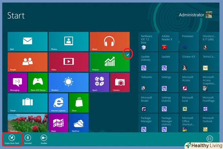 Видалення плиток.для видалення плитки клацніть по ній правою кнопкою миші і виберіть»вилучити з меню Пуск". Ця дія відрізняється від видалення програм, оскільки програма залишиться встановленою на комп'ютері і буде доступна. Просто вона перестане відображатися в меню»Пуск".