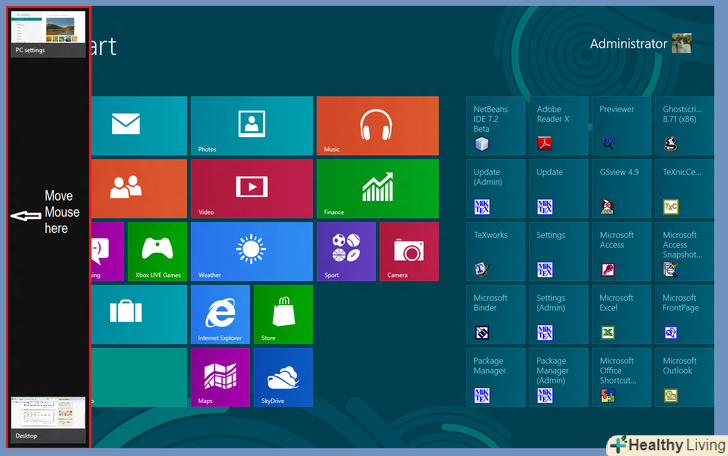 Перемикання між вікнами. для перемикання між вікнами, програмами і додатками утримуйте покажчик в лівому верхньому кутку екрану і натисніть ліву кнопку миші. Так ви зможете переглянути запущені програми. Для швидкого переходу до конкретної програми утримуйте покажчик в цьому кутку і виконайте перетягування вниз, щоб потрапити в аналог панелі завдань, де ви побачите всі відкриті програми.- Не забувайте, робочий стіл-це окрема програма, і вам може знадобитися запустити робочий стіл для переходу безпосередньо до потрібної програми.