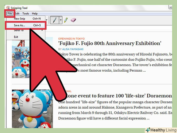Збережіть, додайте коментарі та поділіться з іншими зробленим скріншотом.скріншот буде відкритий в окремому вікні, де ви зможете його зберегти, відредагувати або відправити по електронній пошті.- Щоб зберегти скріншот, натисніть «Файл» - "Зберегти як". У вікні, введіть ім'я файлу і виберіть його формат (якщо необхідно).