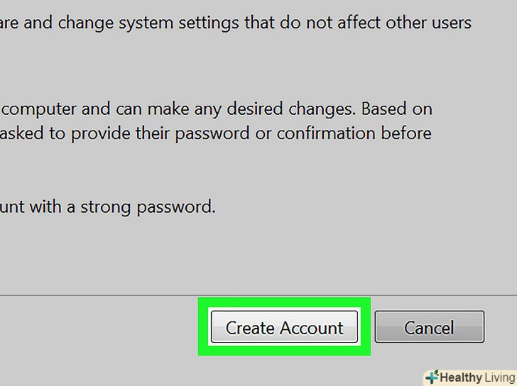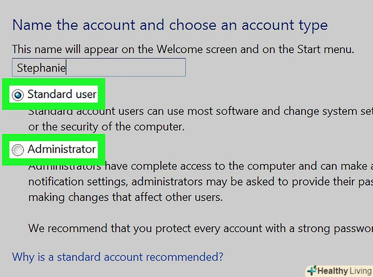 Виберіть тип облікового запису. встановіть прапорець біля «звичайний доступ» або «адміністратор».- "звичайний доступ": в такому обліковому записі можна користуватися більшістю встановлених програм, а також змінювати налаштування системи, які не торкнуться інших користувачів або безпеку комп'ютера.