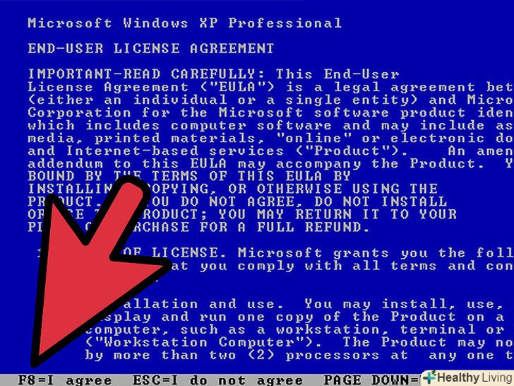 Прийміть ліцензійну угоду.на екрані відобразиться Ліцензійна угода. Так як ви збираєтеся видалити Windows XP, читати угоду необов'язково. Натисніть F8, щоб перейти на наступну сторінку.