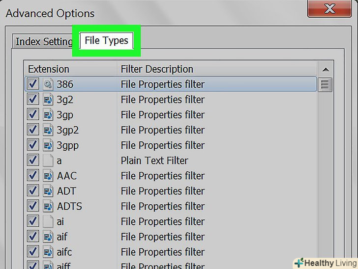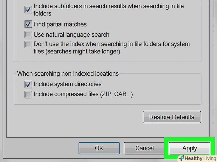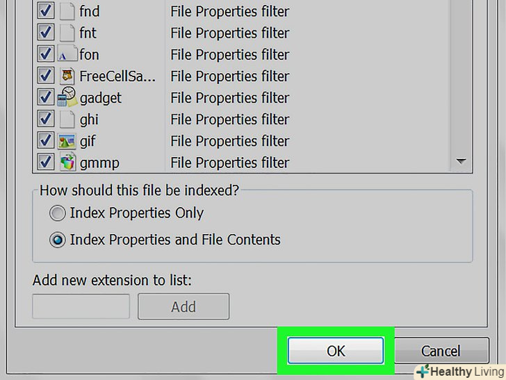 Клацніть поOK.ця кнопка знаходиться в нижній частині вікна. Внесені зміни будуть збережені, а вікно закриється. Тепер пошук буде йти по вмісту певних типів файлів.