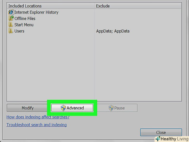 НатиснітьЗміна параметрів служби Windows Search.ви знайдете цю опцію у верхній частині меню "Пуск". Відкриється вікно "Параметри індексування".