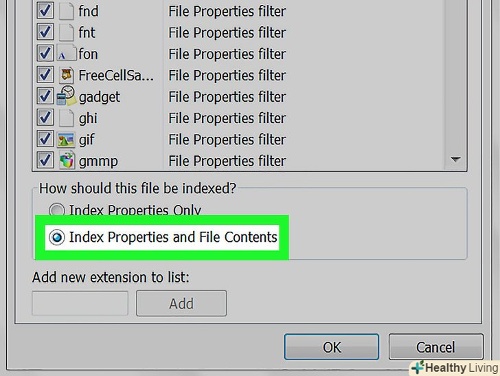 Встановіть прапорець біля опції "індексувати властивості і вміст файлів". ця опція знаходиться в розділі " як слід індексувати такі файли?» в нижній частині вікна.