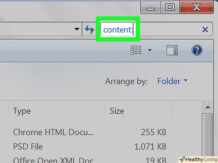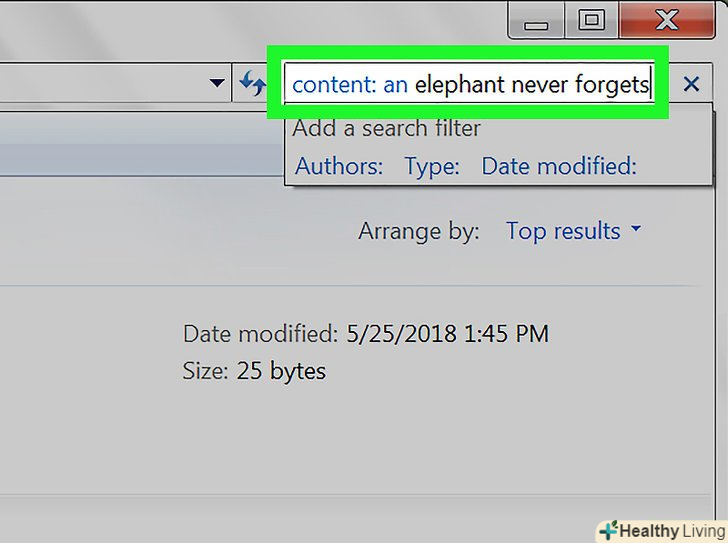 Введіть слово або фразу, файл з якими потрібно знайти.зробіть це після слова «вміст:».- Наприклад, якщо ви шукаєте файл з фразою "слон ніколи не забуває", в рядку пошуку введітьвміст:слон ніколи не забуває.