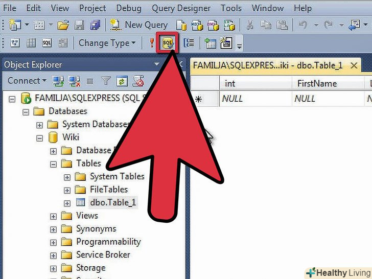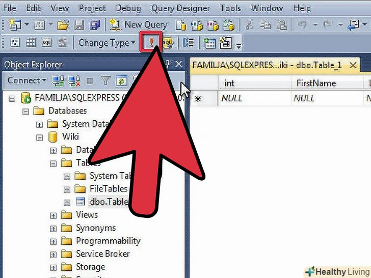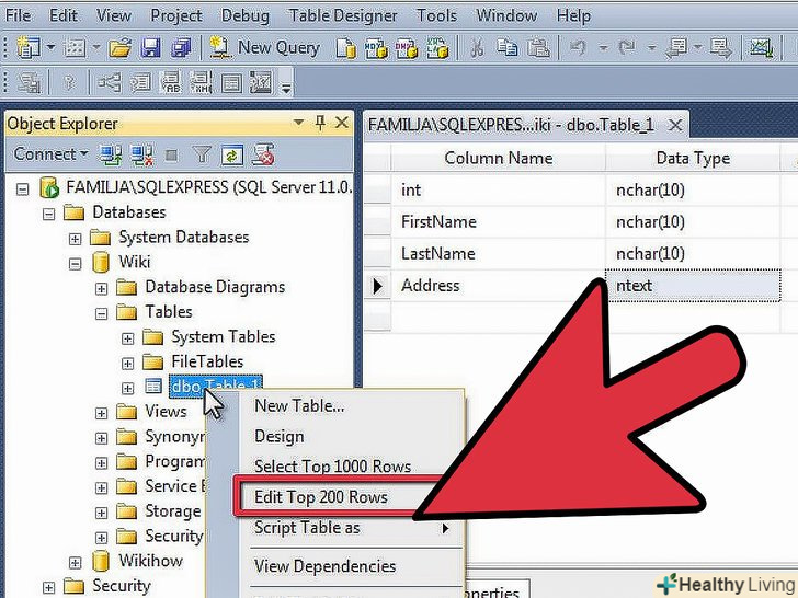 Додайте дані до вашої таблиці.після того, як ви зберегли таблицю, можете почати додавати в неї дані. Відкрийте папку Tables у вікні оглядача Об'єктів Object Explorer. Якщо вашої нової таблиці немає в списку, клацніть правою кнопкою миші на папці Tables і виберіть Refresh. Клацніть правою кнопкою миші по таблиці і виберіть "Edit Top 200 Rows".[4]- Центральне вікно буде відображати поля для вас для початку введення даних. Ваш ID поле заповниться автоматично, так що можете ігнорувати його прямо зараз. Заповніть інформацією інші поля. При натисканні на наступному рядку ви побачите поле ID в першому ряду, що заповнюється автоматично.