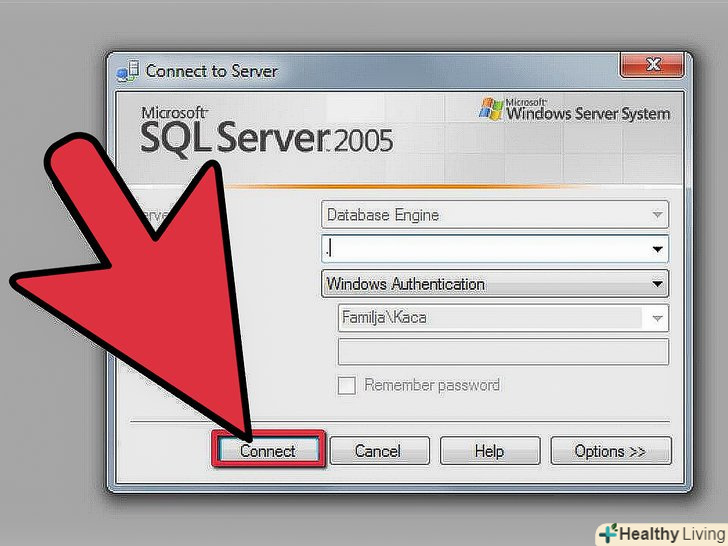 Запустіть SQL Server Management Studio.при першому запуску програми вам буде запропоновано вибрати, до якого сервер підключатися. Якщо у вас вже є сервер і ви працюєте, маєте необхідні дозволи для підключення до нього, то можете ввести адресу сервера та ідентифікаційну інформацію. Якщо ви хочете створити локальну базу даних, встановіть ім'я бази даних database Name як . і тип аутентифікації як "Windows Authentication".- Натисніть кнопку Підключити щоб продовжити.