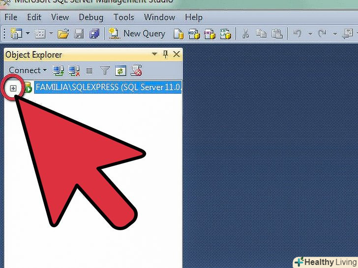 Визначте місце для папки Databases. після виконання з'єднання з сервером (локальне або віддалене), відкриється вікно оглядача об'єктів Object Explorer в лівій стороні екрану. У верхній частині дерева оглядача об'єктів буде сервер, до якого ви підключені. Якщо дерево не розширено, натисніть на значок "+" поруч з ним. Визначте місце папки бази даних Databases.[2]