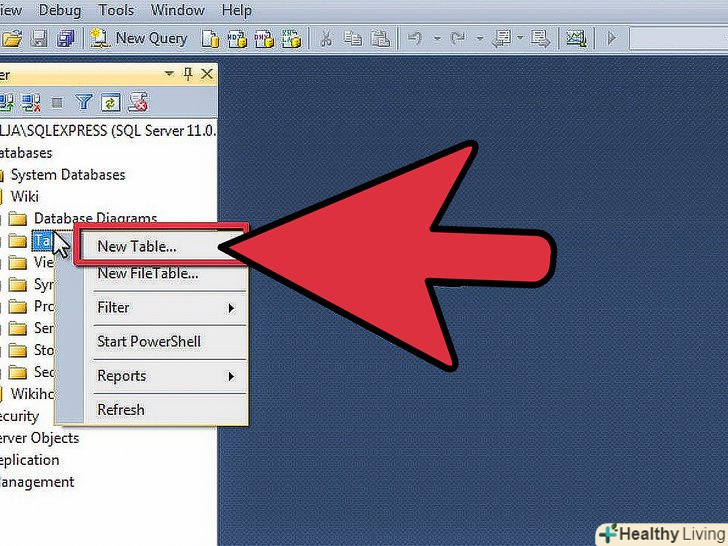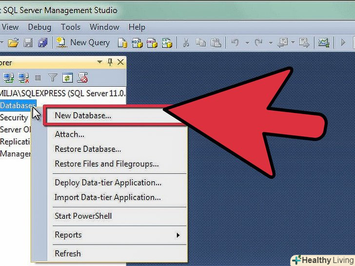Створіть нову базу даних.клацніть правою кнопкою миші по папці Databases і виберіть пункт " New Database...". З'явиться вікно, яке дозволяє налаштувати базу даних перед її створенням. Дайте ім'я базі даних, яке допоможе вам ідентифікувати її. Більшість користувачів можуть залишити значення інших налаштувань за замовчуванням.[3]- Ви помітите, що при введенні імені бази даних два додаткових файлу будуть створені автоматично: Data і Log. Файл даних (Data) вміщує всі дані у вашій базі даних, в той час як файл журналу (Log) відстежує зміни в базі даних.
