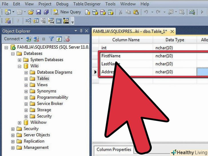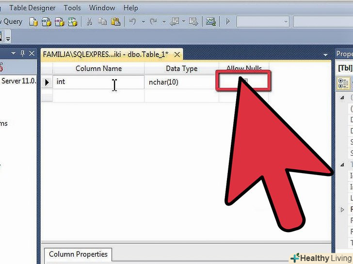 Створіть інші стовпці.коли закінчите заповнення полів для Primary Key, помітите, що нові поля з'являються під ним. Це дозволить вам увійти в свій наступний стовпець. Заповніть поля, як вважаєте за потрібне, і переконайтеся, що правильно вибрали тип даних для інформації, яка буде введена в цьому стовпці:- Nchar (#) - це тип даних слід використовувати для тексту, як імена, адреси і т.д. Число в дужках – це максимальна кількість символів, дозволене для Це го поля. Встановлення ліміту гарантує, що ваш розмір бази даних залишається керованим. Номери телефонів повинні бути збережені в цьому форматі, так як ви не виконуєте математичні функції з ними.
