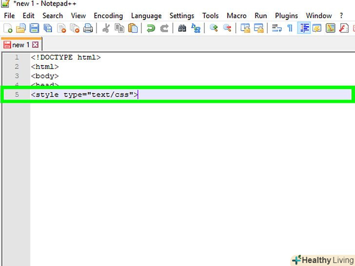 ВведітьLt; style type="text/css"gt; всередині заголовка. Тег "style" поміщається між двома тегами заголовка для створення місця, де за допомогою коду CSS можна буде змінювати дизайн HTML.- В якості альтернативного способу можна використовувати зовнішню таблицю стилів. Прочитайте статтю" Як вставити файл CSS в HTML " , щоб дізнатися, як зв'язати зовнішній файл CSS з файлом HTML.