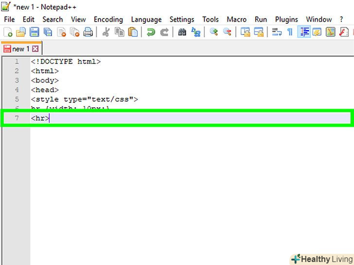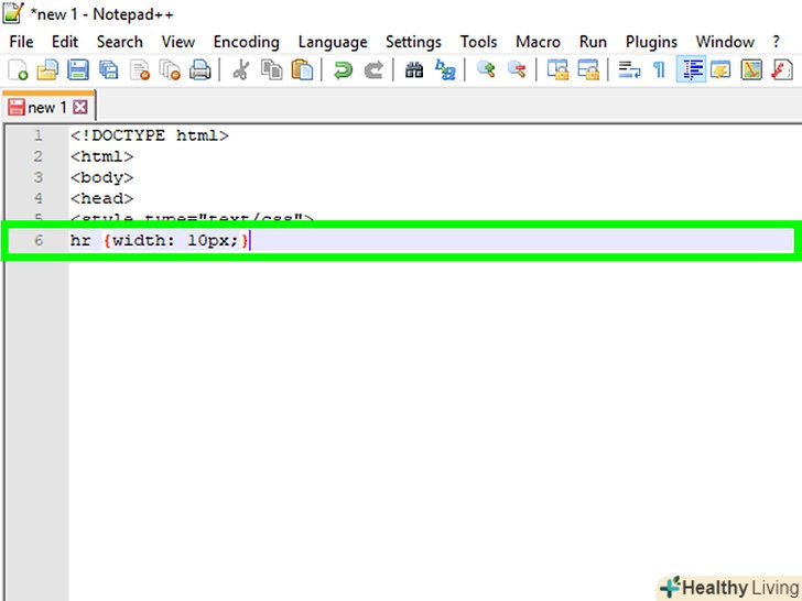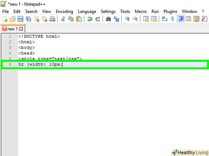 Додайте стилі CSS для тегуLt; hr gt;. вони повинні йти після тега «HR {». Горизонтальну лінію можна оформити безліччю способів. Нижче наведено кілька з них.- Введітьwidth: ##px; , щоб налаштувати ширину лінії. Замініть » # # " значенням ширини лінії в пікселях. Замість пікселів (px) можна використовувати процентне відношення (%).
