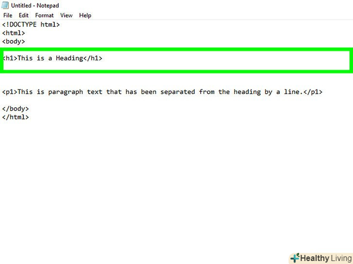 Додайте заголовок до HTML-документа. якщо в HTML-документі ще немає заголовка, виконайте наступні дії, щоб його додати. Заголовок повинен йти після тега Lt; htmlgt;і перед тегом lt; bodygt;.- ВведітьLt; headgt; у верхній частині документа.