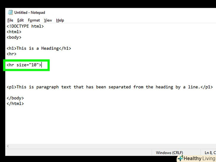 Додайте атрибути до горизонтальної лінії (необов'язково).додайте такі атрибути, як довжина, товщина, колір і вирівнювання. Укладіть їх у фігурні дужки відразу після»hr". Щоб додати кілька атрибутів, розділіть їх пробілом.[2]- ВведітьLt;hr size="#"gt; , щоб змінити товщину лінії. Замініть » # "числовим значенням товщини (наприклад, size="10").
