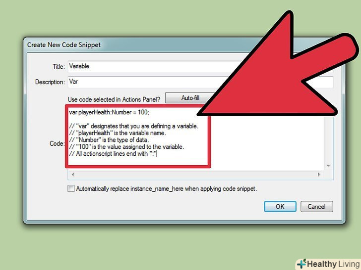 Var PlayerHealth:Number = 100; / / " var " - Ви визначаєте змінну. / / "playerHealth" - це ім'я змінної. //" Number " – це тип даних (тут - числовий). / / " 100 " - значення, приписане змінній. / / будь-який рядок коду на AS3 закінчується"; "