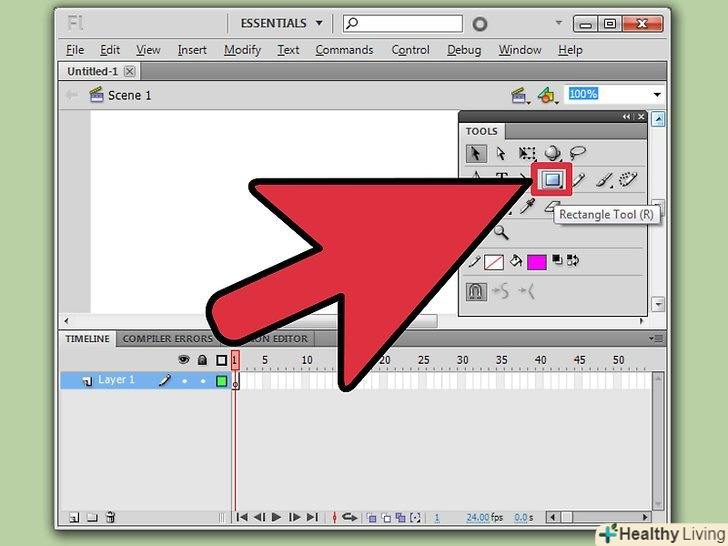 - На панелі інструментів натисніть інструмент "прямокутник". Ця панель може перебувати в різних місцях в залежності від конфігурації Flash Professional. Намалюйте прямокутник у вікні "Сцена".