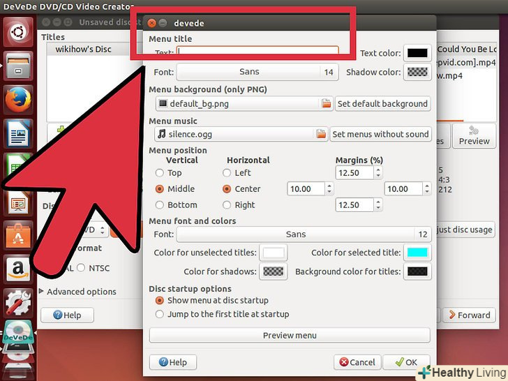 Створіть меню диска.за замовчуванням DeVeDe створить найпростіше меню диска, яке ви можете переглянути, натиснувши на кнопку «Попередній перегляд меню». Натиснувши на кнопку "Параметри меню", ви зможете створити меню, використовуючи інші зображення і музику.