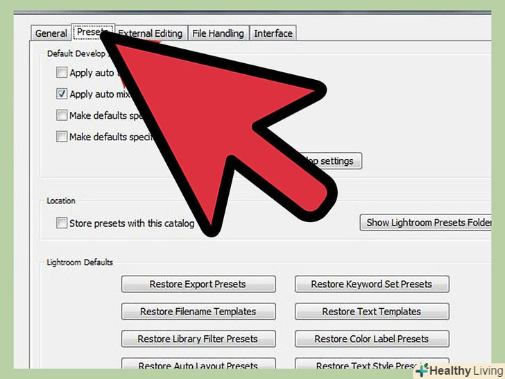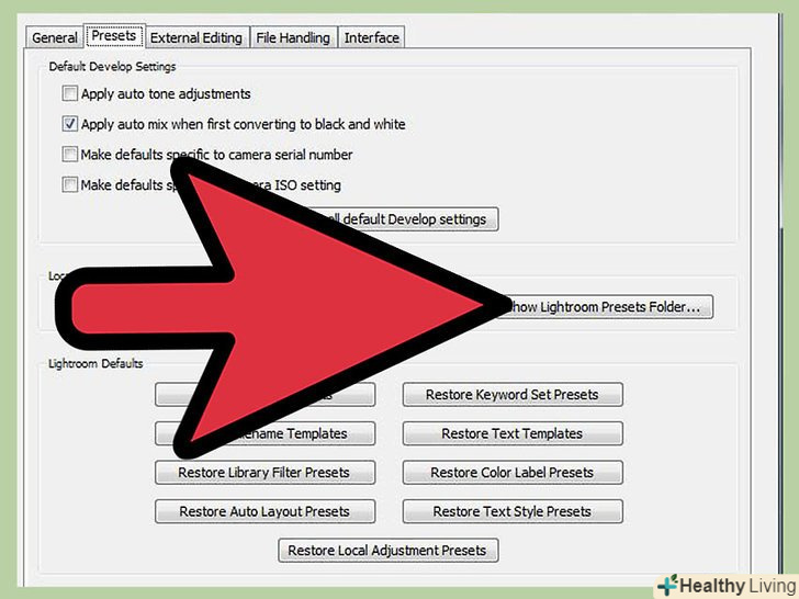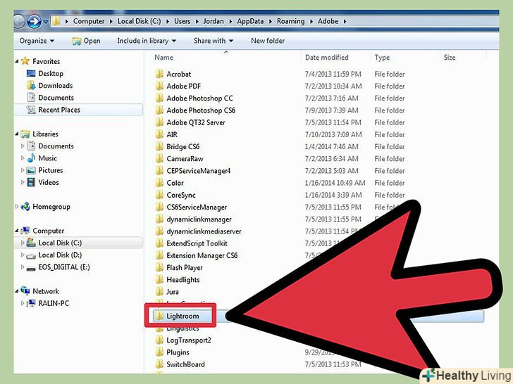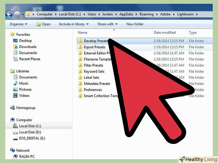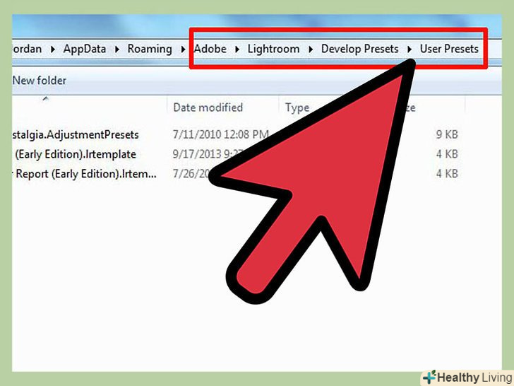 Натисніть на кнопку Показати папку з пресетами Lightroom. З'явиться вікно із зазначенням місця розташування файлу, наприклад, папка з:\Users \ Імяпользователя \ Appdata \ Roaming \ Adobe.