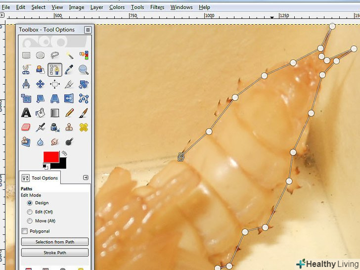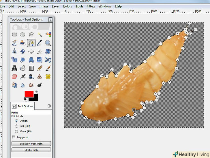 Почніть розміщувати анкори навколо зображення. кожен анкор представлений у вигляді кола, а два анкора з'єднані прямою лінією. Ця лінія є лінією вирізання, тому переконайтеся, що вона проходить в безпосередній близькості від контуру об'єкта, або торкається до нього. Після того як ви досягли точки, з якої почали, перейдемо до наступного кроку.- З'єднайте перший і останній анкори, утримуючи клавішу CTRL і натискаючи на перший анкор' . Це дозволить з'єднати їх належним чином. Якщо ви не утримуєте клавішу CTRL, то натомість пересунеться перший анкор.