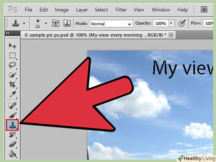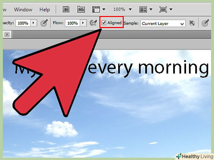 Наведіть курсор миші на досить близько розташовану до тексту точку.затисніть клавішу «Alt», а потім клікніть лівою кнопкою миші по обраному місцю. Це місце буде називатися джерелом. По суті, з цього місця будуть братися кольору фарби для зафарбовування тексту.[10]