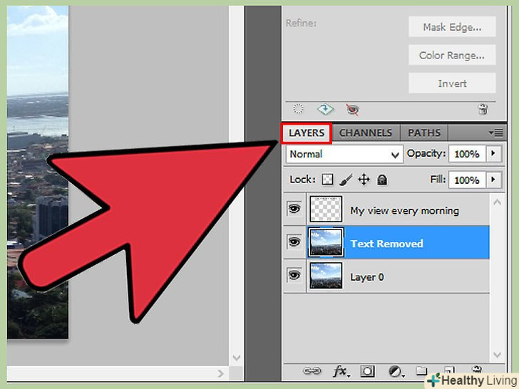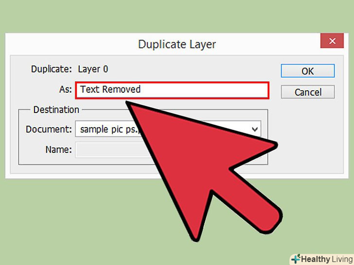 Задайте копії зображення іншу назву. Непогано буде виправити назву копії зображення. В іншому випадку ви легко можете переплутати його з оригіналом. Щоб ви без зусиль могли розібратися з шарами зображення, для копії ви можете залишити стару назву шару, але додати до нього в кінці великими літерами фразу «з віддаленим ТЕКСТОМ».- Для цього клікніть правою кнопкою миші по шару 1. У вас з'явиться можливість перейменувати шар. Введіть нову назву. Натисніть кнопку "Return «(для macOS) або» Enter" (для Windows), щоб зберегти внесені зміни.